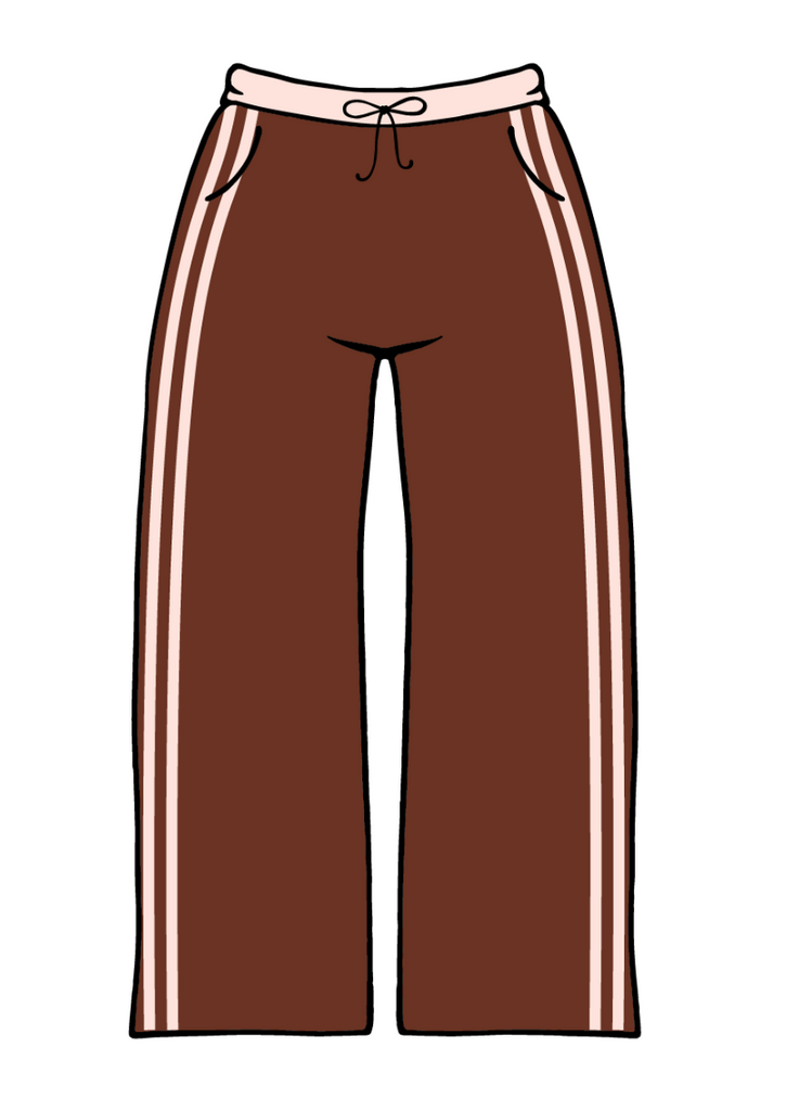 This design will be available to purchase on a custom wide leg sweat pant in brown and pink. The fit is true to size.Â