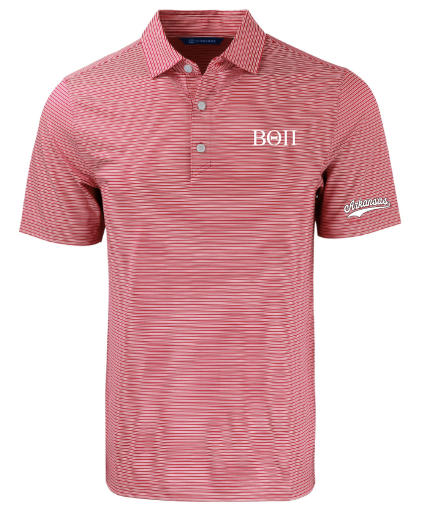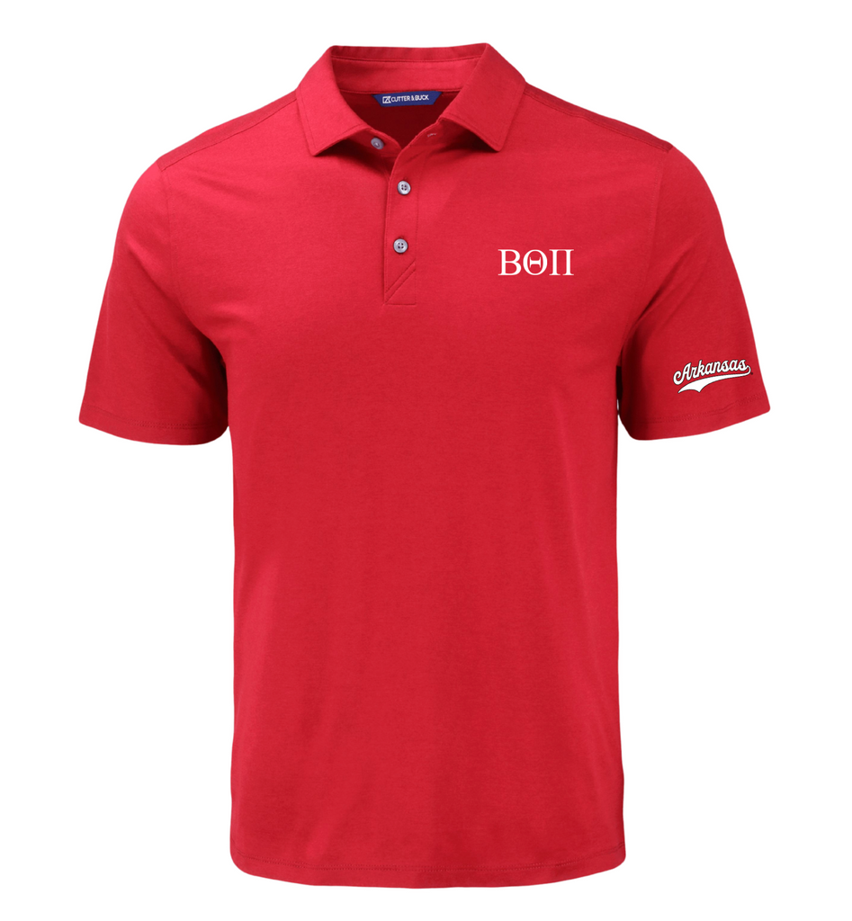 This design will be embroidered and available to purchase on a Cutter & Buck double striped performance polo in the colors Solid Red, Double Stripe Red, and White. The fit is true to size.Â