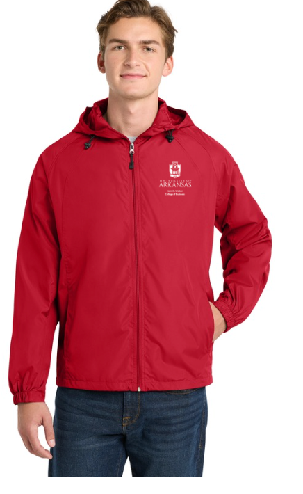 This design will be embroidered and available to purchase on a Sport-Tek® Hooded Raglan Jacket in Red and Black. The fit is unisex and true to size.Â