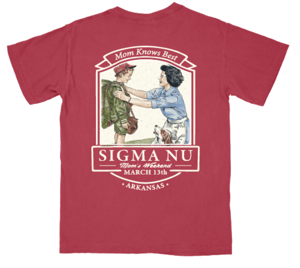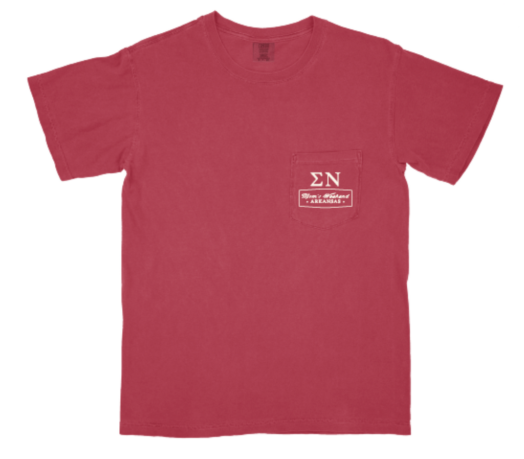 This design will be screen printed and available to purchase on a Comfort Colors pocket tee in the color Crimson. The fit is true to size.Â